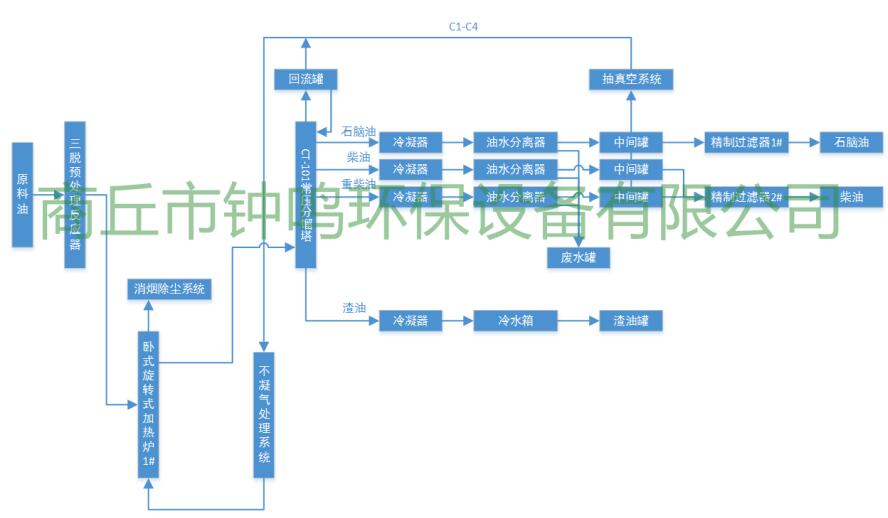 本生產(chǎn)裝置是利用廢機油生產(chǎn)柴油及副產(chǎn)品生產(chǎn)線(xiàn),裝置主要配置;預處理反應罐、臥式旋轉加熱爐,常壓分餾塔、列管式冷凝器、冷卻水槽、油水分離器,過(guò)濾器,精制過(guò)濾罐;預處理系統;加熱系統;蒸餾系統;冷凝系統;真空負壓及廢氣回收處理利用系統;消煙除塵系統;安全消防、防爆、靜電接地系統;水處理循環(huán)利用系統;自控半自動(dòng)控制系統等組成。本裝置采取臥式旋轉加熱爐加熱可以連續式生產(chǎn),處理量為5-10噸 (根據客戶(hù)需求,可定制間歇式生產(chǎn)線(xiàn))